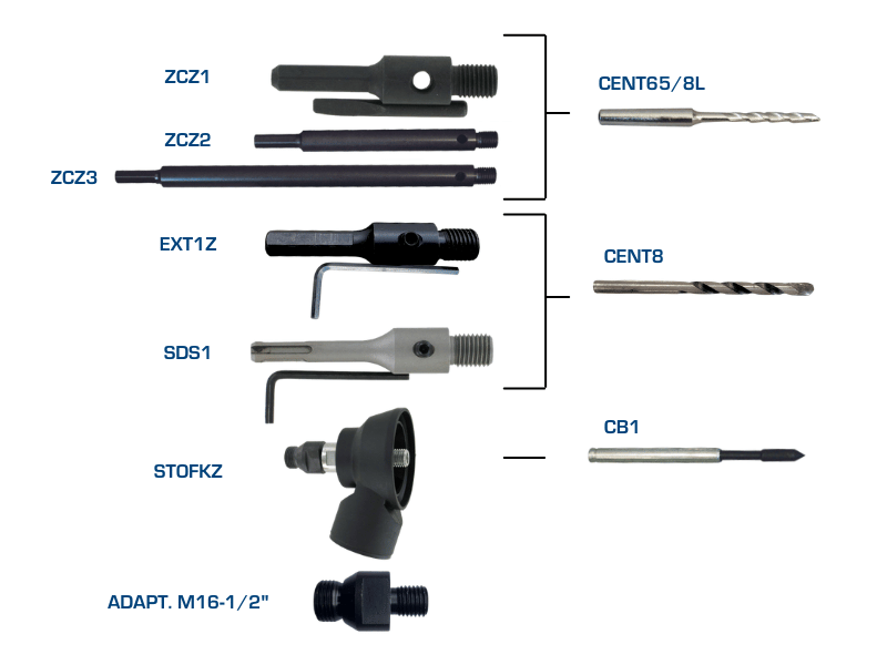 A range of dust extraction adaptors to fit different machines to reduce dust while drilling.